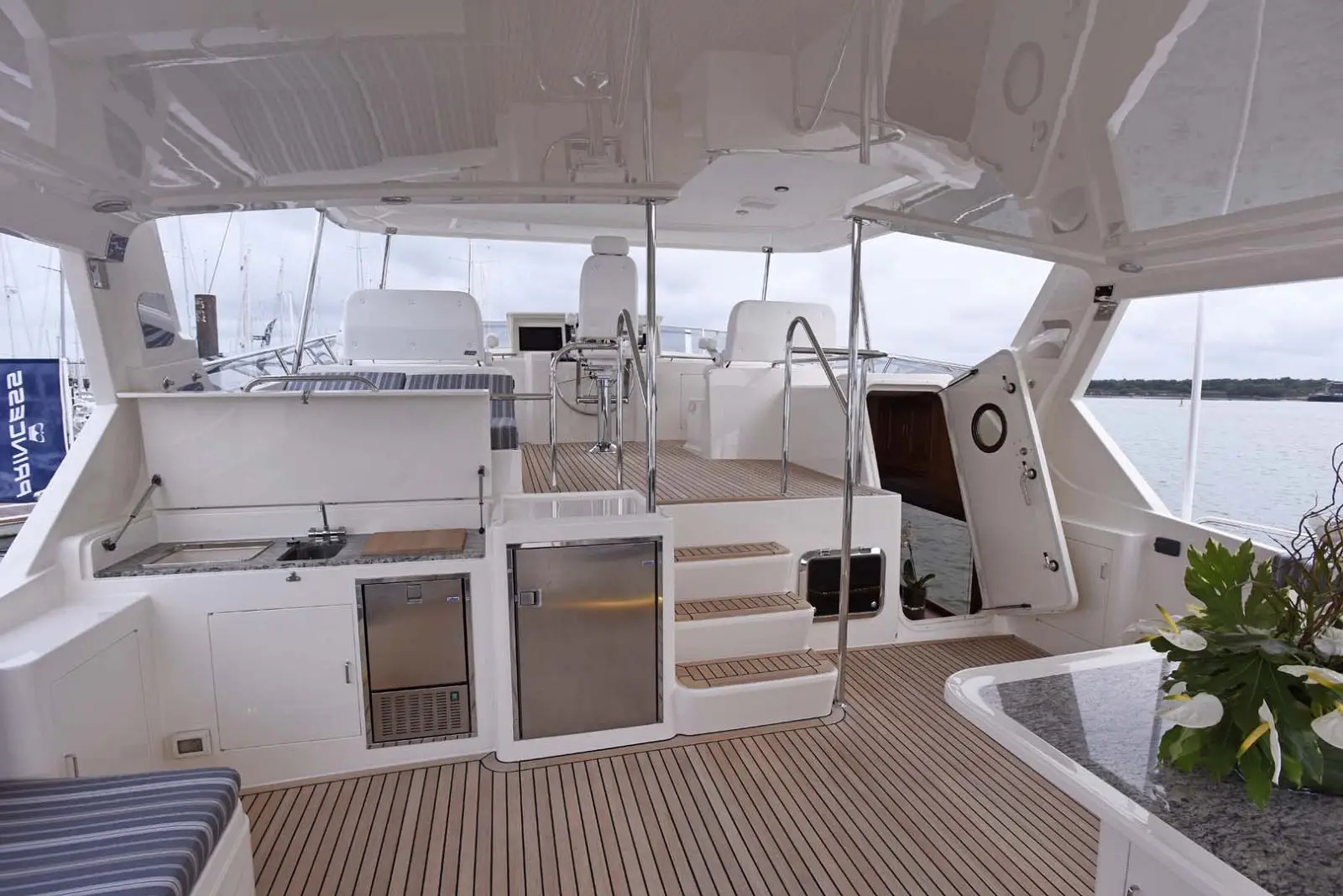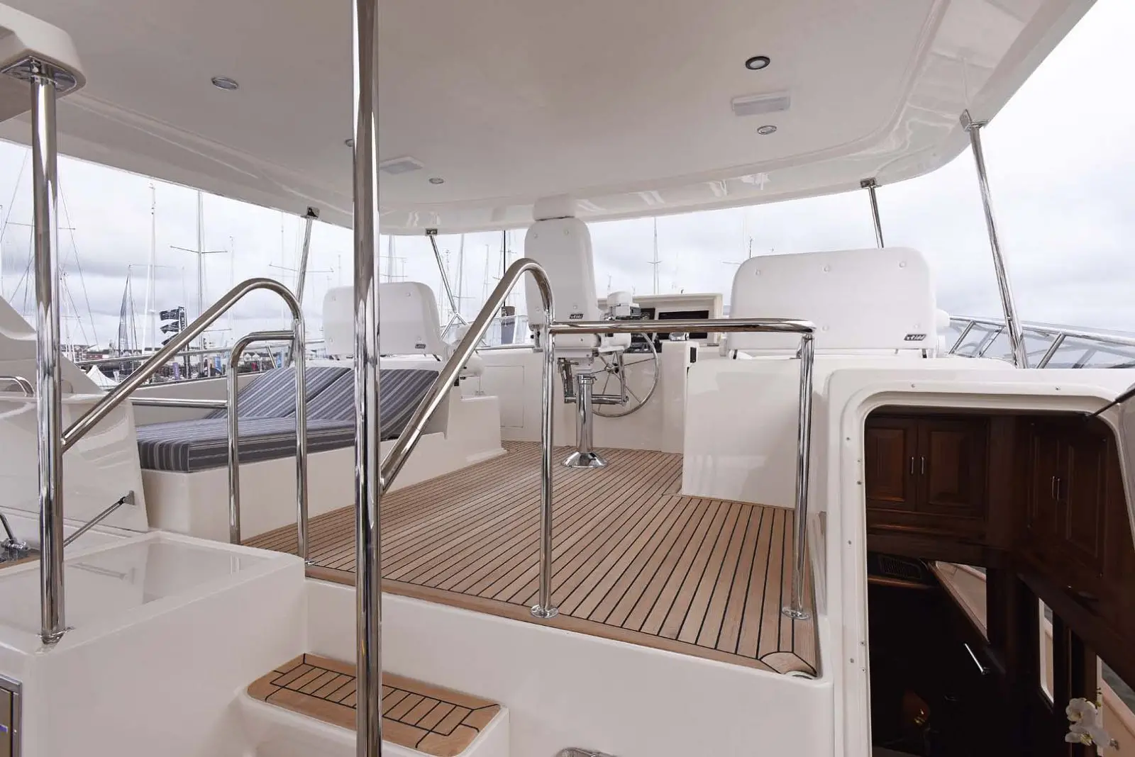 The manual pull for the engine-room fire system and remote fuel shut-off valves are concealed behind the door on the aft face of the California deck. A large powered centerline hatch provides access into the lazarette. A teak-dressed step across the aft face of the California deck provides seating and a place to put equipment for activities such as scuba diving. Offered as an option is a retractable engine/thruster control station which folds away into the aft face of California deck structure.