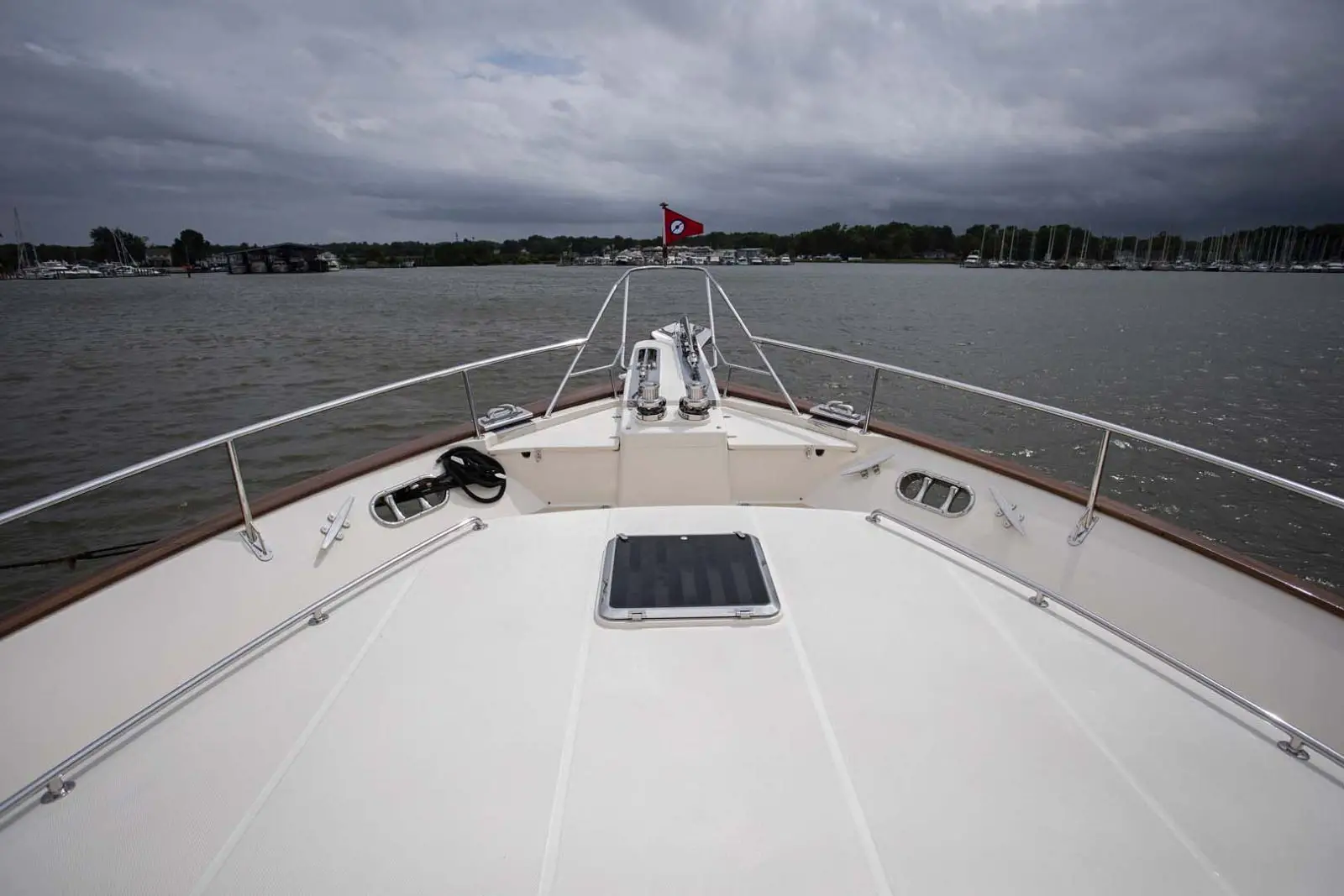The forepeak is accessed through a deck hatch immediately aft of the windlasses and is separated from the rest of the boat by a watertight, collision bulkhead. It is divided into two chain lockers each with its own bitter end fitting. There is ample room for stowage of lines, and the forepeak drains directly overboard.