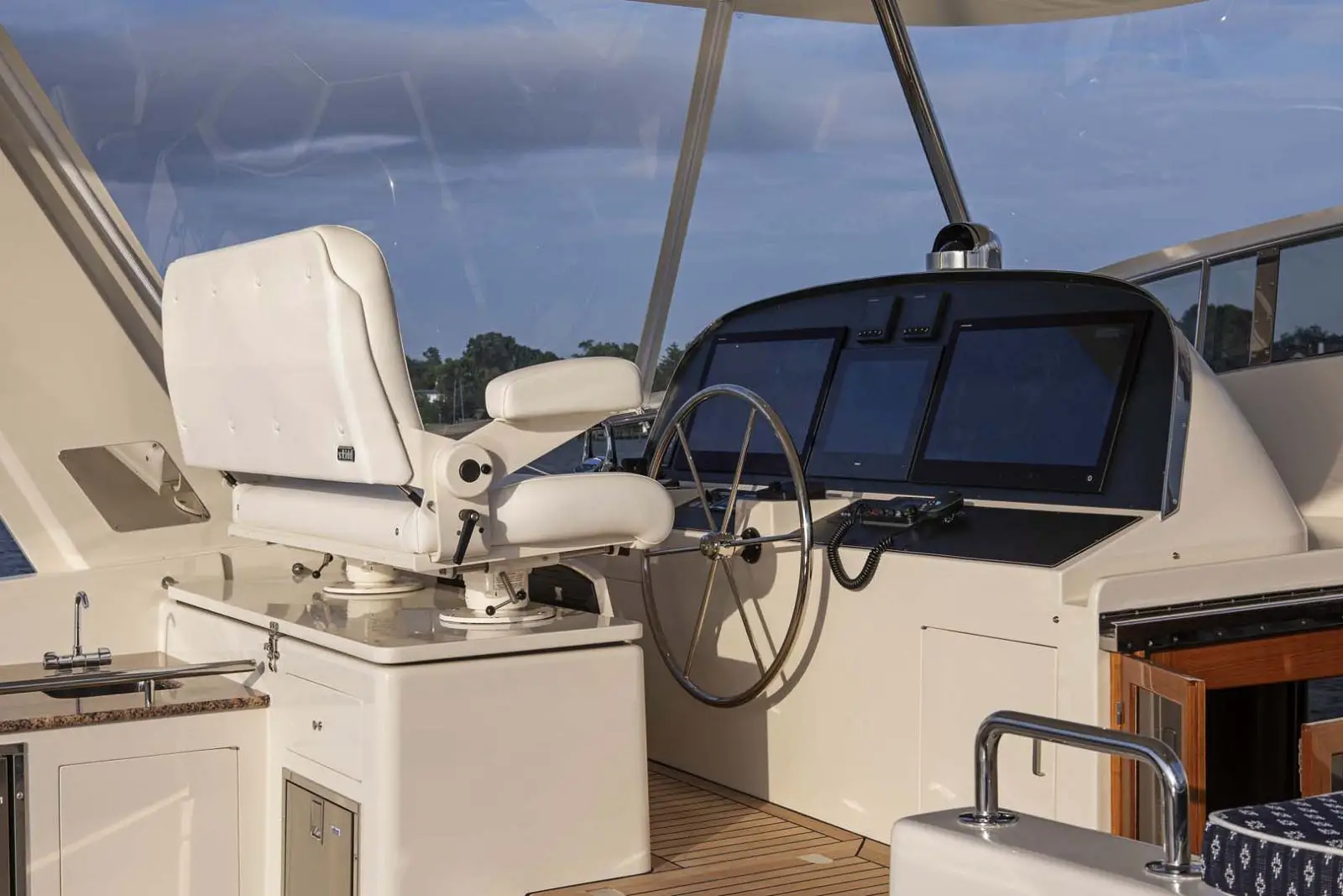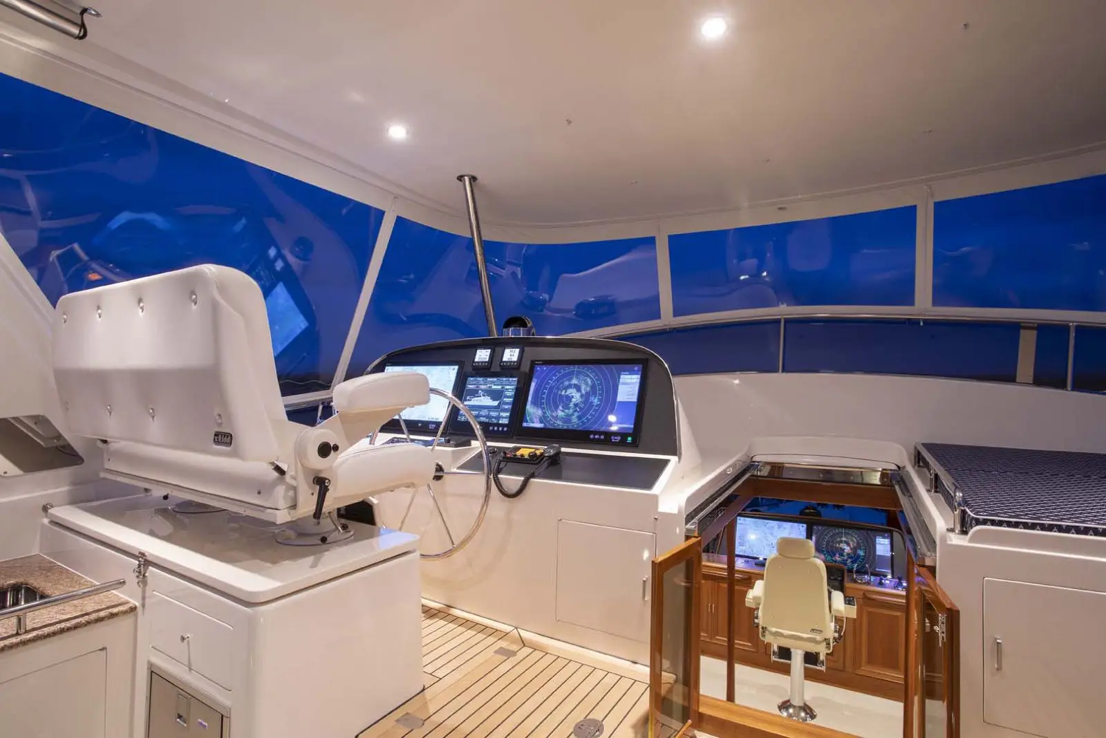The flying bridge area is divided into two levels and has three distinct functional areas. The upper level is effectively an open-air pilothouse which features a helm station with full engine and thruster controls, instrumentation and a unique electronics console which retracts into the flybridge structure when not in use. There is a Stidd helmseat behind the stainless steel destroyer-type wheel and Stidd bench seats on either side of it. An aft-facing L-settee area includes a table and space to stbd for a bench-type freezer. A venturi shield with an integral stainless steel handrail curves around the front and side of the upper bridge to the radar arch.