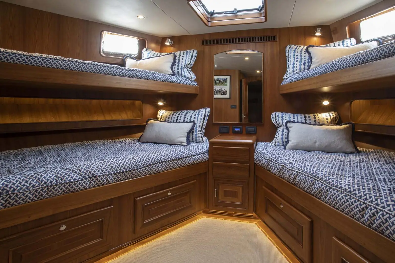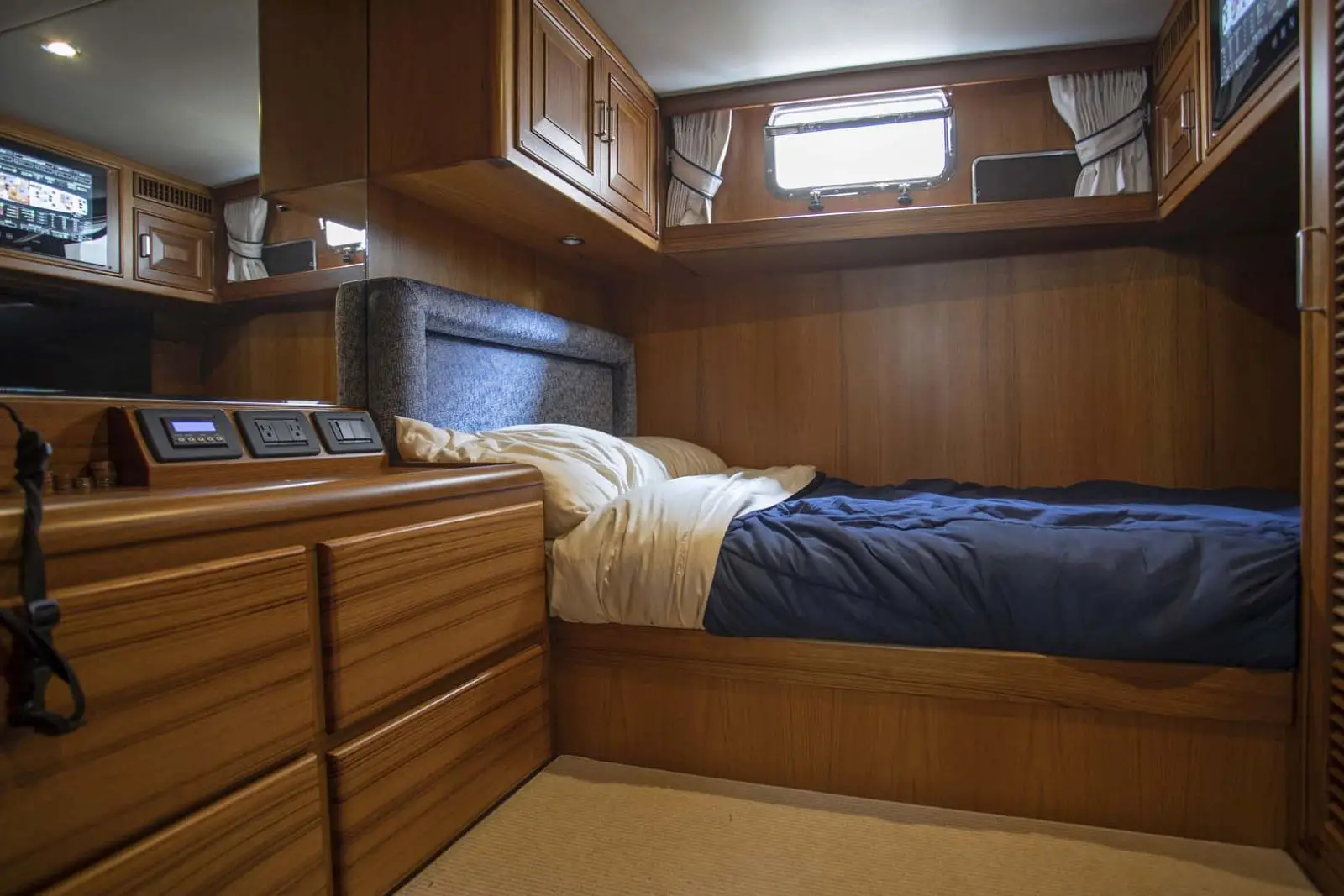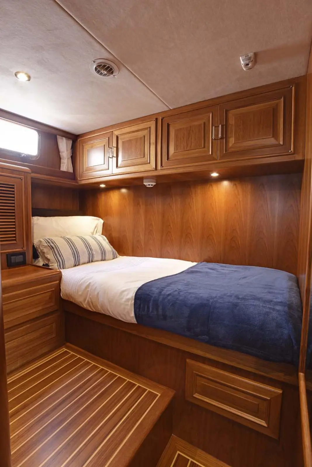 The aft lobby opens into the crew head, the crew cabin and the engine-room. This allows the crew head to be accessed without having to enter the crew cabin. The crew cabin has two hanging lockers, one 45" wide berth and a second 36" wide berth, ample drawer space and additional overhead storage. There is also a mirror, desk with escape hatch over and two CE-approved portlights. The crew head has a washbasin, shower and  toilet. A 15" color touchscreen connected to the FFM monitoring system is included as standard in the crew cabin. This ensures that the crew are aware of any alarms and can monitor the yachts systems remotely. The internally insulated submarine-type door to the engine-room has a glass inspection port. There is also an option for two seperate crew cabins.