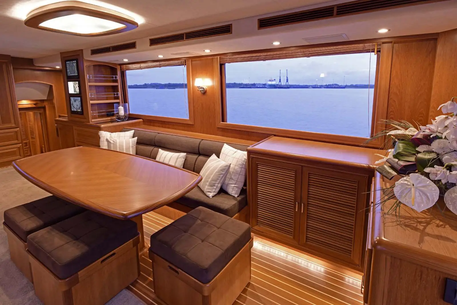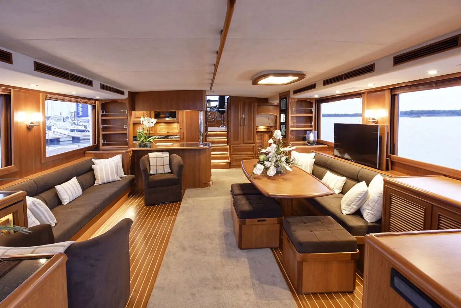 With a combined area of 350 sq ft. these three spaces flow together to form a luxurious yet functional area made even larger by the extension of the salon onto the California Deck through the aft doors. Teak and holly soles are standard throughout as are wood mini-blinds recessed into the window frames.